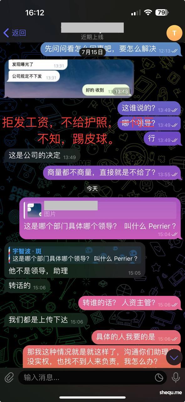 本人是此集团前Aseana 3 商务部门KM包网员工,欧洲杯之前公司出规定最后在职日期必须为7月15日之后,刚开始也是想遵守公司规定,提出干完欧洲杯结束再离职,然后主管经理即便是干完欧洲杯再走也不批你OA,强制给你转岗到铂金做招商,后续7月1日当天和新部门沟通实在不想做,当天辞退回去。 现在离职已经在外面等了18天,护照不给,咨询那个狗专线就说在走流程,降签,让我等30-45个工作日。 试问同行里还有哪家公司离职需要在外面等这么久的? 我问旅行社都说降签半个月之内就好。 多方找人沟通无果,迫于无奈只能曝光了,然后这个公司以此为由直接拒发工资,现在是护照不给,工资也被黑。 0赔自带9G来给你干了大半年,离职你搞得我护照也没工资也没,现在回国回不了,去别处上班也没护照。行,光脚不怕穿鞋的,现在结果再坏也无所谓了。老子不报警找NBI上A3当面和你要算我来菲律宾白混这么多年,你觉得你名声已经够臭无所谓,死猪不怕开水烫那就来。