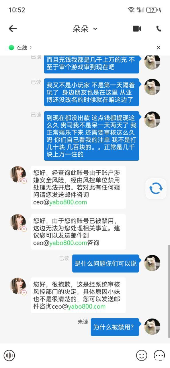 不知道是不是主管中饱私囊,贵司难道没有高层领导在管事吗?寒了老玩家的心,属实了,希望出面与我交涉,否则支付宝商户包括手底下跑分这些卡投诉到底,真是搞不懂,一个稳定的玩家,你们黑这点钱 不够我一个月的流水,这是何必?编理由也编的高级一点 什么叫团队对刷流水 真牵强 说出去都笑死人 你不如直接说我们只提供娱乐 出款是违法的赌博行为 这样不是更好吗?你家对刷吃蚊子肉对刷吗?那还真的是亏得裤子都不剩了吧 我是玩家 不操心这些 但是黑钱就是你们的不对了 挂着亚博的皮,干的都是人事吗?
