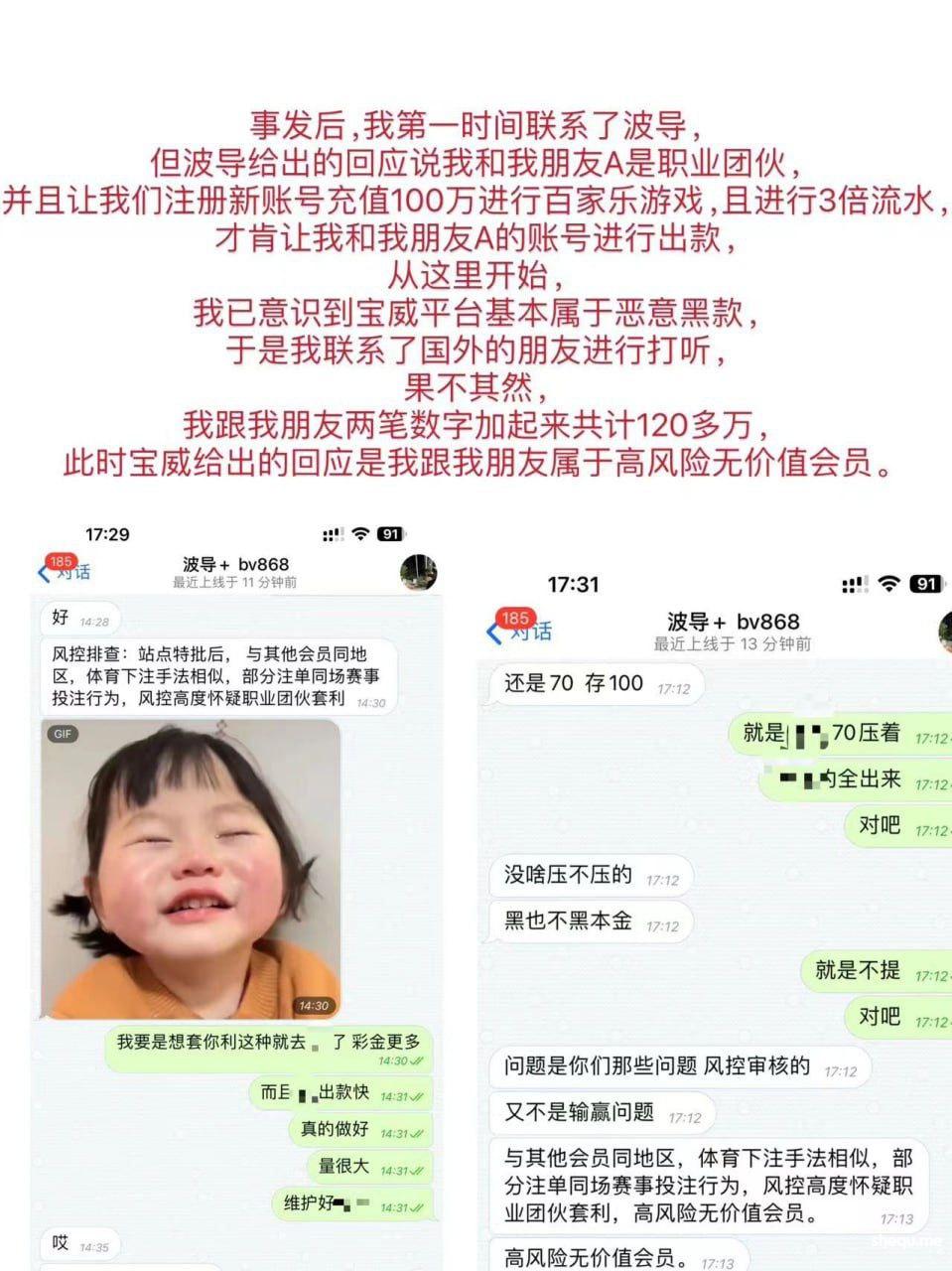 故事的起因在今年3月份,本人经过朋友推荐认识一个宝威平台名叫波导的代理,欧洲杯期间由于一开始上下分都非常正常,并且波导给我大量的平台优惠政策,想我投注量流水更大,当时本人觉得对自己来说无伤大雅,所以就按照他的要求对宝威平台进行充值。 建立在信任宝威平台的前提下,我加大了投注量,但从7月份开始,平台开始找各种理由借口拖延提款的时间,但好在名为波导的高管,都会在第一时间及时处理这些问题,并且得到了有效的解决,导致我越来越信任他,且进行了大金额充值,从而慢慢的掉入宝威精心谋划的陷阱....