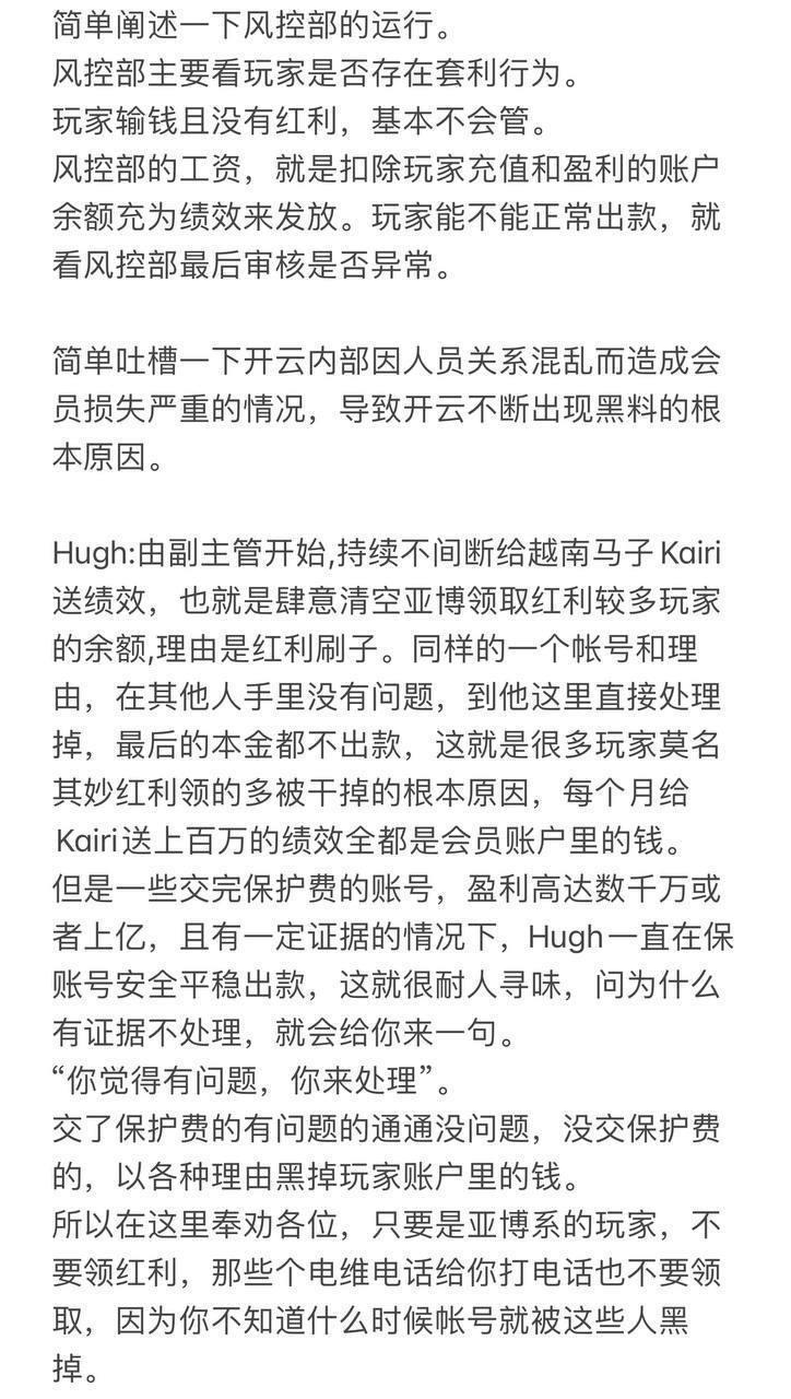 亚博旗下的开云等平台风控部门管理混乱,内部充斥着利益交换和贪污腐败现象。部门管理者利用玩家的本金和盈利作为垫脚石,以此填充自己的业绩,铺设升职的道路,甚至通过这些不义之财来中饱私囊,或与外部势力进行套利合作,支付保护费。