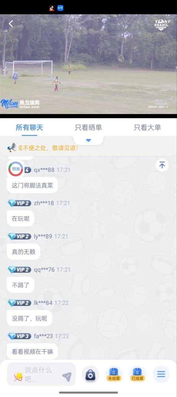 米兰体育诈骗 杀猪会员 昨天巴西比赛,89分钟下注小2.5,结果96分钟还是1-1。后面时间91分钟3-1就变成勒3-1。专员回复说比赛中断关了盘了,实际没有关盘,下注大2.5  大3大3.5/4全部取消,下注小的全部确认。一场比赛拼接视频来诈骗,杀会员,把会员杀了还叫不要曝光,还要会员给他们掩护。全程就是在拖处理事情过程中间还叫会员继续充值玩,准备黑一波。