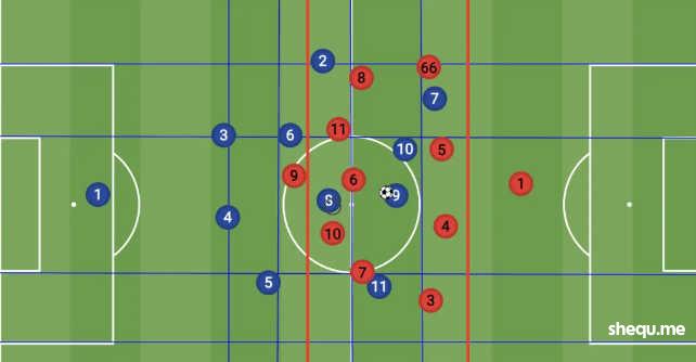 而中场中路有5人,使得球队在中路和肋部的推进当中局部区域有压倒性的过载优势。
